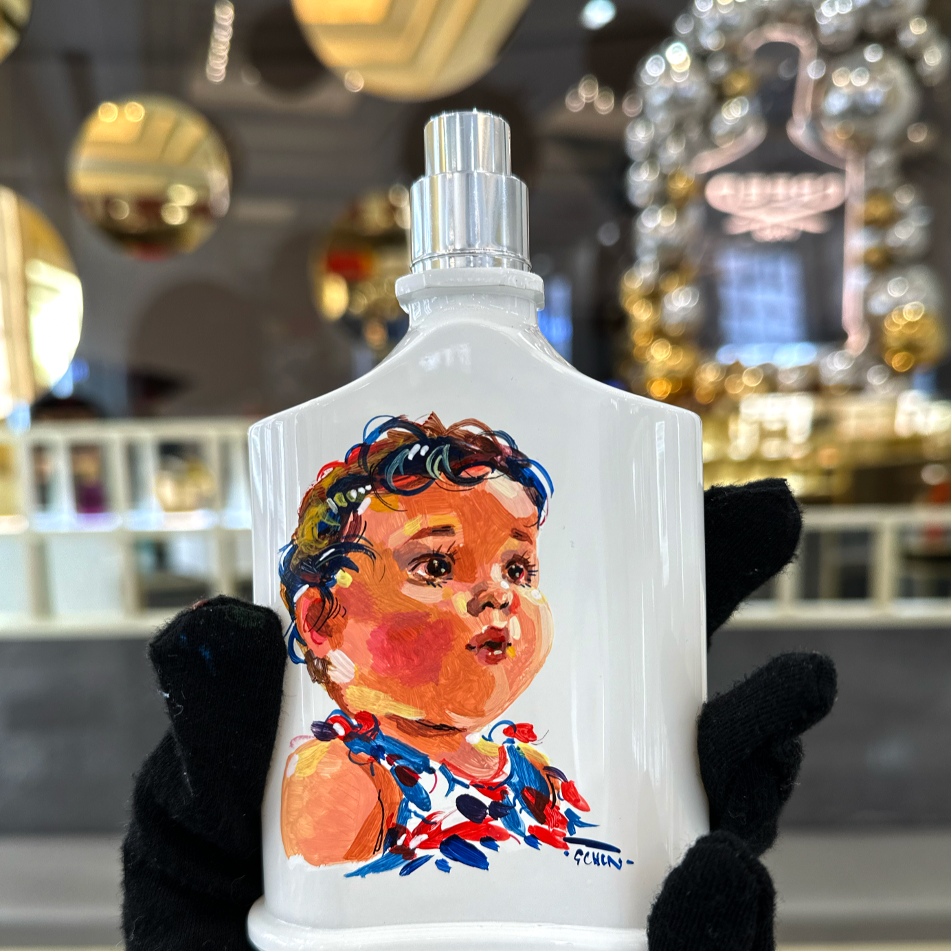 Hand painted art on leather goods, fragrances, wine/champagne bottles and other materials